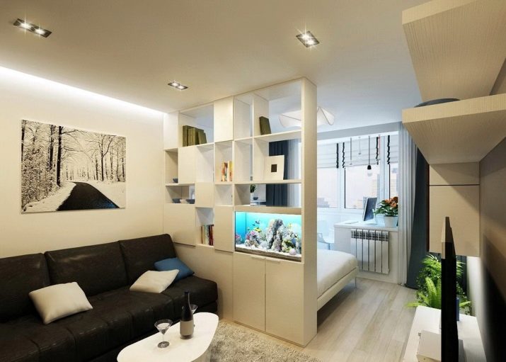 يتضمن التقسيم الحديث للديكورات الداخلية الصغيرة استخدام المواد التي تسمح بتقسيم شقة الاستوديو إلى عدة مناطق للحصول على تصميم مريح. الأكثر شيوعًا استخدام دريوال. يمكن استخدامه لإنشاء تصميم غريب الأطوار للجدران المقسمة وتزيين منطقة لاستقبال الضيوف ومشاهدة التلفزيون والاسترخاء. يمكن أن تكون الحواجز مستطيلة ، شبه منحرف ، مع قواطع مختلفة ويمكن استخدامها كأرفف للزهور أو الكتب. يمكن أن تكون بمثابة أساس لتركيب الألواح الضوئية بمصابيح LED..