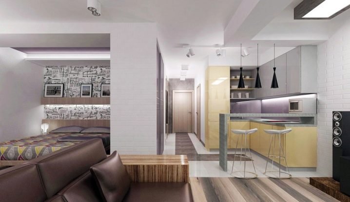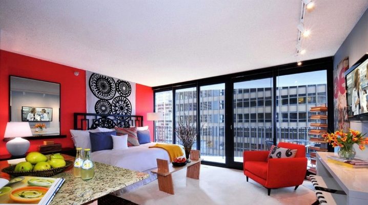 وبالتحديد ، حيث ستكون هناك غرفة طعام ومطبخ ، حيث توجد منطقة للترفيه واستقبال الضيوف ، وأين توجد منطقة النوم ، وأين منطقة العمل. بعد ذلك ، يجب عليك تحديد نظام الألوان المخطط لهذا المسكن. إذا كان زوجان شابان يعيشان في شقة استوديو ، فسيكونان سعداء بالتصميم الملون والجريء للجدران والأرضية ، مما يعكس حالتهما الداخلية ومزاجهما..