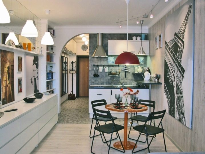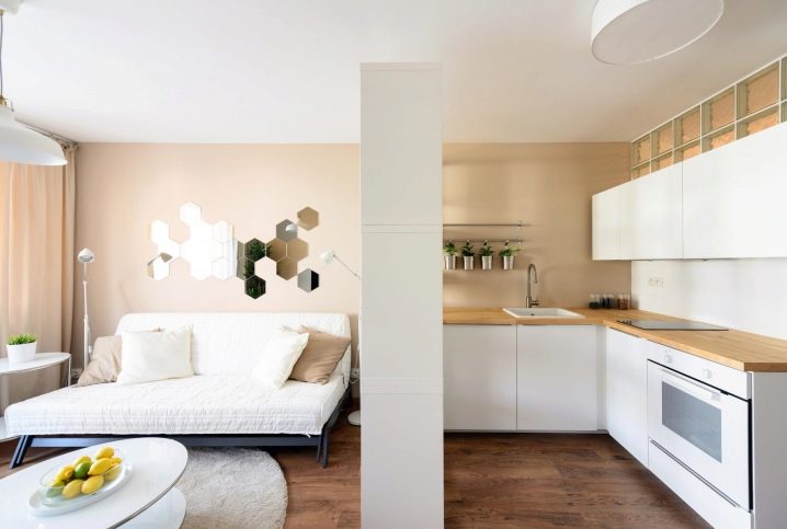 ستضفي الخزائن المدمجة الواسعة والأجهزة المنزلية المدمجة ، التي تفرغ الأجزاء الداخلية بالكامل ، مظهرًا أنيقًا ومريحًا للاستوديو على شكل حرف L. يمكن أن يكون الحل المناسب لغرفة المعيشة الضيقة هو رفض الأثاث الضخم لصالح الهياكل المدمجة القابلة للطي: أسرة في منطقة الجلوس وطاولات في منطقة تناول الطعام. الانتهاء من الأرضية بألواح الصنوبر الفاتحة والسطح الأبيض للجدران والأثاث الملصقة سيجعل الغرفة بصريًا أكثر إشراقًا وأكثر اتساعًا..