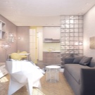 سيكون الخيار المثير للاهتمام هو الاستوديو المستطيل المصمم من شقة من غرفة واحدة مع شرفة أو لوجيا. من خلال إرفاق لوجيا بزجاج عالي الجودة ، تزداد المساحة الإجمالية للغرفة بعدة أمتار مربعة ، وتكتسب مساحة غرفة المعيشة إضاءة طبيعية إضافية. يتم استخدام لوجيا في مثل هذه الشقة كمنطقة ترفيهية مع أريكة صغيرة أو دراسة مع مكتب كمبيوتر. لمنح غرفة المعيشة وحدة بصرية لوجيا ، من الأفضل إنهاء الزخرفة بنفس نظام الألوان باستخدام نفس المواد.