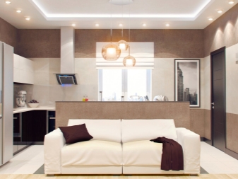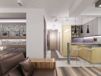 عند اختيار الأثاث ، انتبه إلى الأرائك الصغيرة بظلال الباستيل ، والتي تتحول بسهولة إلى سرير مزدوج كامل. بهذه الطريقة ، يمكنك توفير مساحة وعدم إفساح المجال لمنطقة نوم منفصلة مع سرير. أما بالنسبة لمطبخ شقة الاستوديو الحديثة ، فيمكن تجهيزه بطاولة بار ، والتي ستصبح نوعًا من محدد المساحة.