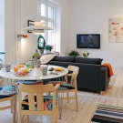يمكن أن تجمع غرفة المعيشة في شقة الاستوديو بين وظيفة غرفة الطعام. يمكنك بسهولة وضع طاولة مستديرة كبيرة في منتصف الغرفة. إذا كان هذا الخيار لا يناسبك ، فامنح الأفضلية لطاولة قهوة قابلة للتحويل. يحتوي الجدول المنخفض على العديد من خيارات التحويل. ترتفع على أرجل خاصة وتتحرك ، تتحول الطاولة إلى طاولة طعام جيدة.