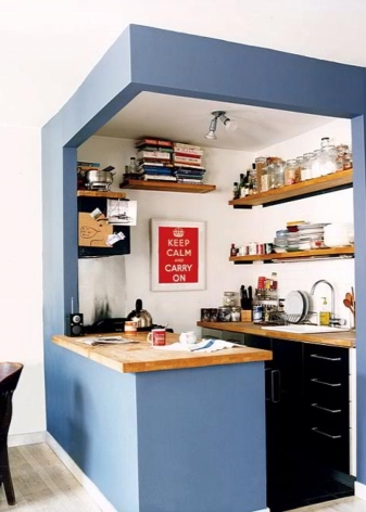 إذا كانت غرفة النوم وغرفة المعيشة في شقة الاستوديو واحدة ، فيجب أن يكون المطبخ مساحة منفصلة. إذا كنت ترغب في إعطاء المطبخ مساحة أقل ، وتركه لمنطقة المعيشة ، فاختر مجموعة مطبخ صغيرة ولكن عملية.