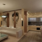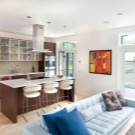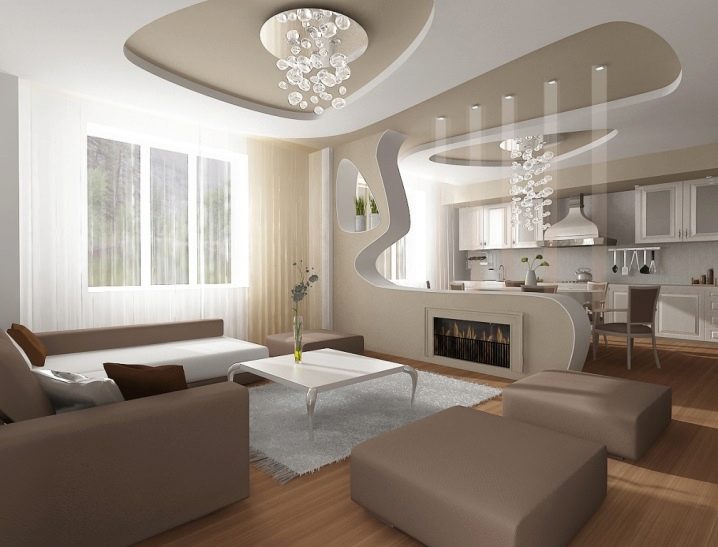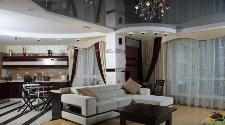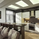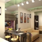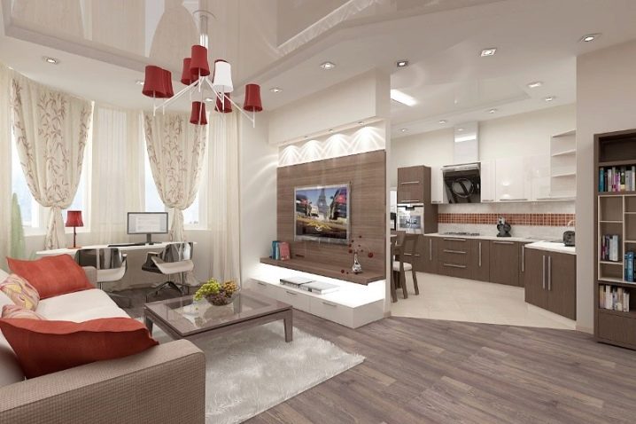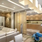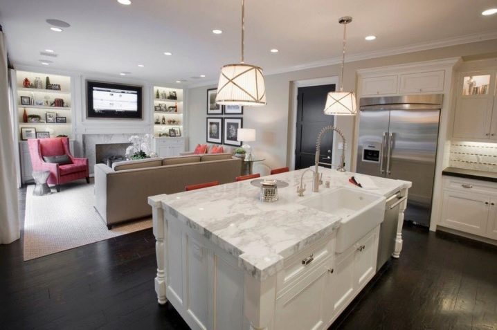 إضاءة. يمكنك تحديد المساحة باستخدام تركيبات الإضاءة. في هذه الحالة ، الشرط الأساسي هو وجود أجهزة الإضاءة في كل منطقة. ستبدو مصابيح LED أو المصابيح الصغيرة التي تعمل على طول حدود السقف بين المطبخ وغرفة المعيشة رائعة للغاية. إذا كانت وحدة المطبخ تحتوي على حاجب ، فيمكنك بناء مصابيح تضيء منطقة العمل. وفي مساحة غرفة المعيشة يمكنك تعليق ثريا كبيرة أو عدة مصابيح غير إضاءة المطبخ.