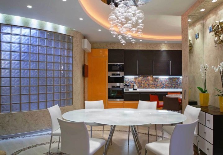 سيقدر عشاق التركيبات الحديثة بالتأكيد القسم الداخلي المصنوع من الكتل الزجاجية. يمكن أن تكون شفافة أو ملونة تمامًا. لمزيد من التأثير ، يمكنك إنشاء إضاءة إضافية على الكتل. سيضيف هذا الأناقة إلى داخل الشقة دون أن يثقلها..
