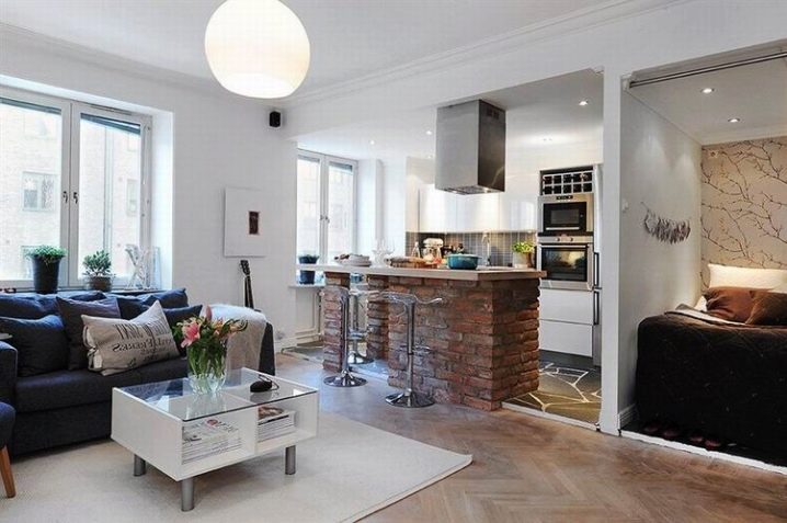 تقسيم مساحة الاستوديو بالأثاث. يمكن لفصل المطبخ عن غرفة المعيشة أن: