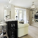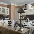 يتم تشجيع الأثاث البسيط ذو الخطوط النظيفة والمستقيمة. إذا كانت هناك رغبة في ترتيب شيء عتيق في مثل هذه الشقة ، مع المنحوتات والتذهيب ، على سبيل المثال ، كرسي بذراعين عتيق جميل لا تريد التخلي عنه ، يجب أن تجعله الشيء المركزي في الشقة.