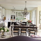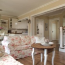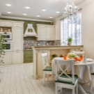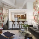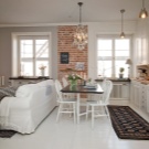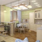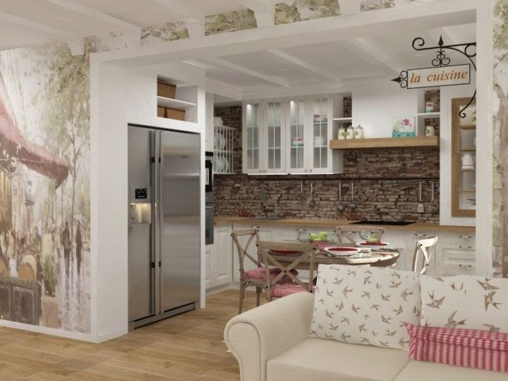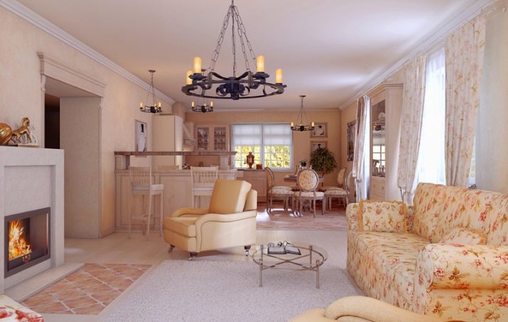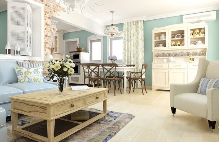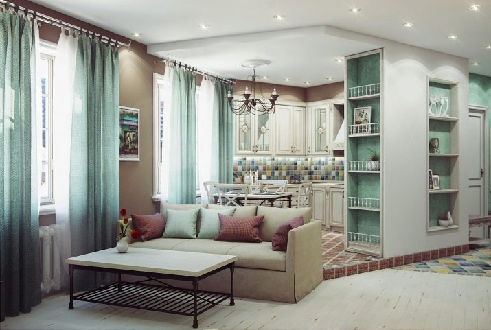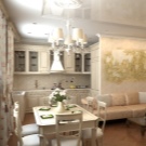 يمكن أن تكون بقعة الألوان الزاهية هي تنجيد الأريكة والكراسي بذراعين ، المصنوعة من القماش بألوان داكنة وعملية. في مثل هذه الشقة ، يجب أن تكون الزهور موجودة ، إما حية أو في شكل نقوش أو مطبوعات على المفروشات. ستبدو منطقة المطبخ بهذا النمط متناغمة عند الانتهاء من الأثاث بقشرة طبيعية ، يعكس لونها ظلال الأجزاء الخشبية للكراسي بذراعين والأريكة. سيتم اختيار مثل هذا التصميم الداخلي للعيش من قبل شاب رومانسي..