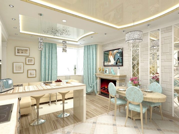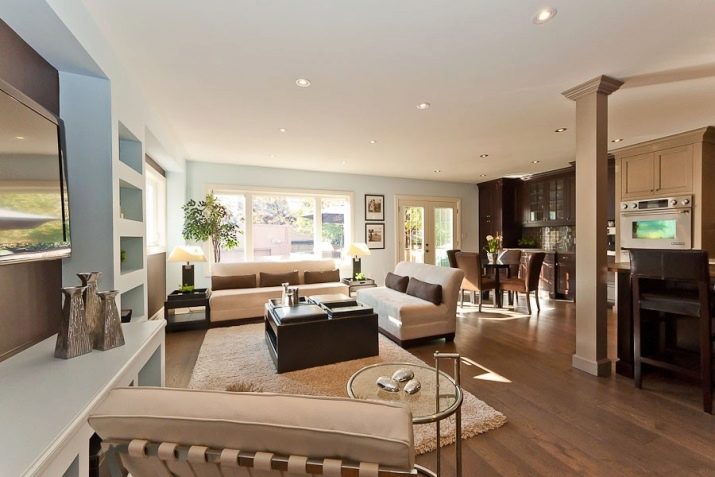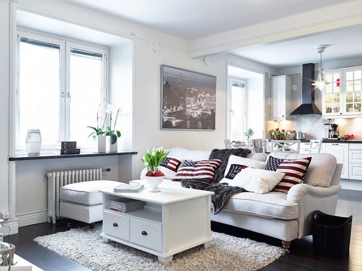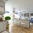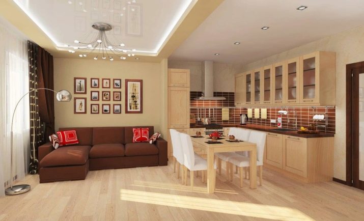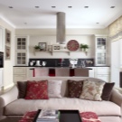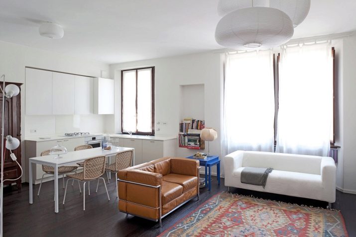 ميزة أخرى يعتبرها الكثيرون ميزة لهذا التصميم: يتم دمج المطبخ وغرفة المعيشة في نفس منطقة المعيشة. هذا مناسب أثناء الحفلات ، عندما يكون كل ما تحتاجه “في متناول اليد” ، ولكن ليس دائمًا مريحًا بسبب روائح المطبخ المصاحبة للطهي المنزلي. لحل هذه المشكلة ، تحتاج إلى تثبيت نظام تهوية جيد. يمكنك فصل مساحة المطبخ بصريًا عن طريق رفع الأرضية في هذا المكان ، وبالتالي سيظهر المطبخ كما لو كان على منصة.