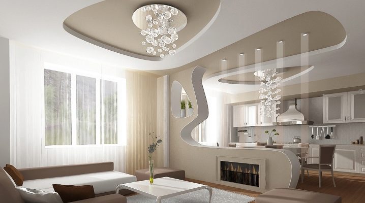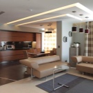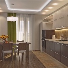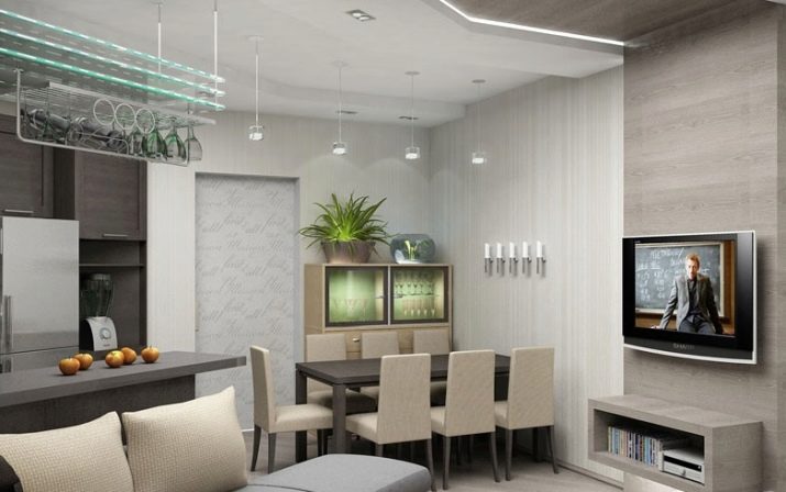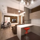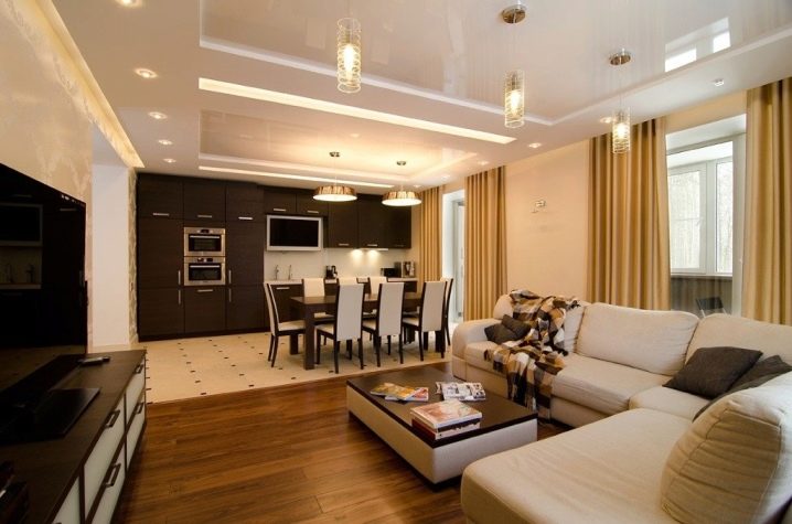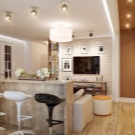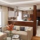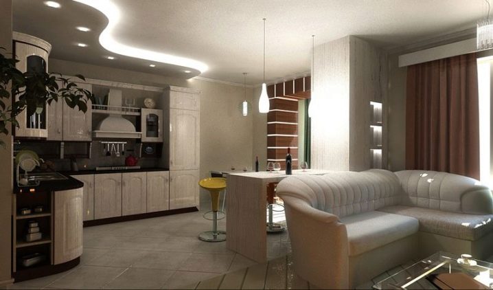 الخيار المعاكس ممكن أيضًا ، عندما يتم خفض الأرضية في منطقة المطبخ إلى حد ما ، وبالتالي التأكيد على الأهمية القصوى لغرفة المعيشة.
