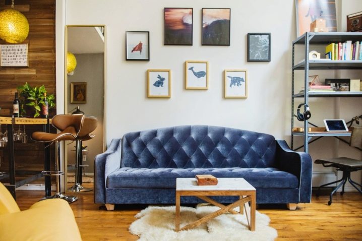 يتم إعطاء لمسة إضافية لمساحة المطبخ بمساعدة الإضاءة. يمكنك فصل جدار المطبخ عن طريق اختيار ورق الحائط المناسب. منطقة النوم بهذا النمط ليست مغلقة بأي شيء ، لأن مالك الشقة هو شخص غير مقيد بالاتفاقيات. لا يوجد الكثير من الأثاث ، فهو ذو قيمة وظيفية بحتة ولا يتظاهر بأنه أنيق. تتكون غرفة المعيشة من أريكة ، يمكن وصف نسيجها بأنه عملي وليس زخرفيًا. الجدران مزينة برسومات جذابة وغير قياسية ، وألوان مائية للأطفال ، ربما تنتمي إلى مالك الشقة. هذه شقة ذكورية بشكل نموذجي ، وليست مثقلة بالديكورات والتفاصيل الداخلية الصغيرة..