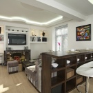 حل تصميم مشرق في الاسلوب “الصناعية الحديثة”: الأريكة القطيفة الأنيقة في وسط غرفة المعيشة تخلق بقعة مضيئة مقابل الحائط الباستيل وهي ملفتة للنظر. يعكس لونها خزانة الكتب والألوان المائية على الحائط. أرضية المعيشة الخشبية مصنوعة من اللامينيت ، ويتكرر الزخرفة الخشبية في زخرفة الجدار بالقرب من طاولة البار الخشبية محلية الصنع.