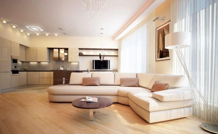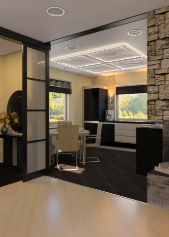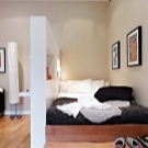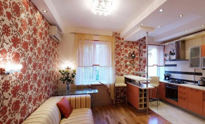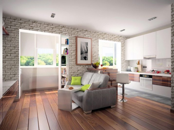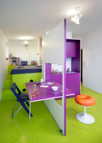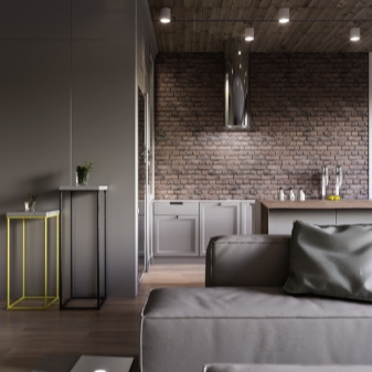 تم تخصيص جزء أصغر من الغرفة للمطبخ ، وتشغل غرفة النوم وغرفة المعيشة معظم الغرفة. في غرفة مربعة ، تقع هاتان المنطقتان بالتوازي مع بعضهما البعض ، مفصولة بالجص ، وأقسام زجاجية ، مفصولة بخزانة ملابس أو أريكة ، وهيكل منصة خاصة. يمكن أيضًا تحقيق التقسيم إلى مناطق من خلال اختيار بسيط من مواد مختلفة القوام في كل من زخرفة الجدران (الطلاء وورق الحائط والجص الزخرفي والتشطيب باستخدام الحجر الطبيعي أو الخشب) والأرضيات (صفح ، بلاط سيراميك ، مشمع).