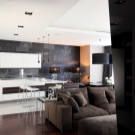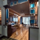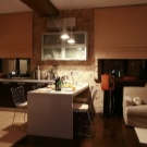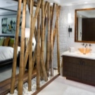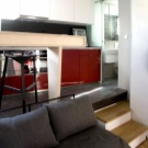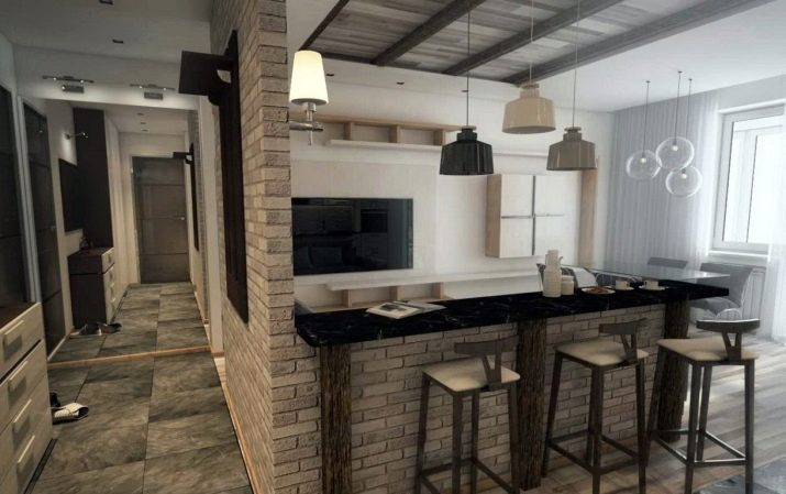 كفصل بين المطبخ والغرفة الرئيسية ، يمكنك استخدام طاولة بار – عنصر شائع جدًا في الدور العلوي. ستبدو قطعة الأثاث هذه غير عادية وتعطي الاستوديو مزيدًا من الأناقة. من الأفضل استخدام الخشب كأقسام داخلية..