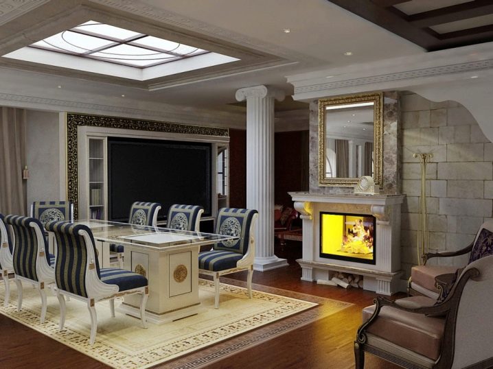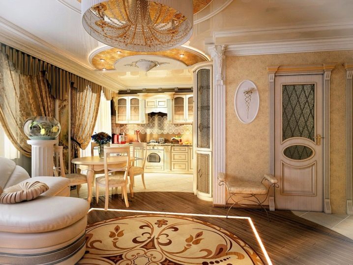 لتزيين شقة استوديو ، يمكنك أيضًا استخدام الطراز العتيق.. يفترض أن وسط الغرفة خالي من الأثاث. من الأفضل تزيين الأرضية بالبلاط الخزفي والجدران بالجص أو الحجر المزخرف. الأثاث الفاخر ، المزين بالمنحوتات والمعدن ، سوف يتناسب بشكل متناغم مع هذا النمط. الأقمشة الطبيعية الخفيفة مناسبة للستائر. يتضمن تصميم السقف للأسلوب العتيق نقوشًا بارزة ، ولكن يمكنك استخدام امتداد منتظم.