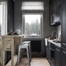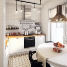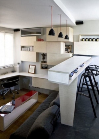 - أعط الأفضلية للأجهزة المدمجة عند ترتيب منطقة المطبخ. يمكنك اختيار طاولة قابلة للطي وتخزين كراسي ضيوف إضافية في الخزانة. سيكون عداد البار المجهز بمثابة حل جيد ، والذي سيصبح أيضًا خيارًا لتقسيم المطبخ وغرفة المعيشة ؛