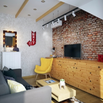 عند تجديد الغرفة الرئيسية ، يمكنك توفير الكثير. على سبيل المثال ، ترك السقف غير مشوه ، وأسلاك غير مخفية ، وترك الجدران مُلصقة فقط أو مُلصقة بورق حائط بتقليد البناء بالطوب – كل هذا يتميز بتصميم غير عادي بأسلوب الدور العلوي.