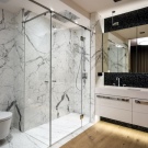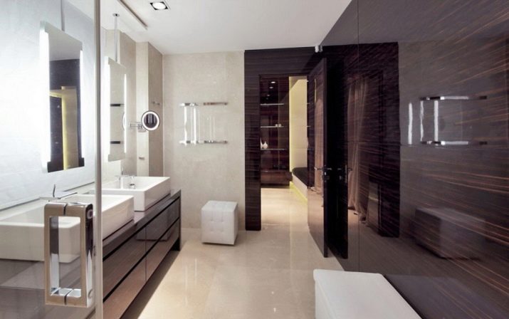 ينصح المصممون بجعل حوض الاستحمام باللون الأبيض ، المفضل للبساطة ، مع الاستخدام الذي لا غنى عنه للسباكة الحديثة ذات الجودة العالية. يمكنك تخفيف اللون الأبيض بالمناشف والسجاد اللامع..