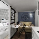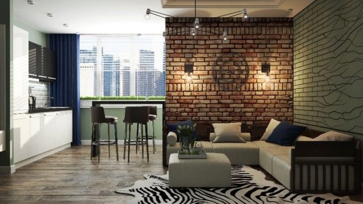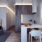 - هنا ، يتم فصل منطقة الترفيه عن المطبخ بواسطة قسم مريح مع تشطيب من الطوب. في منطقة المطبخ ، يقع الأثاث بشكل مضغوط على طول الجدران ، يوجد في الوسط طاولة على شكل طاولة بار. كل منطقة لها الإضاءة الخاصة بها. على الرغم من هذا التمييز الواضح ، فإن العناصر الداخلية في هذا الاستوديو مرتبطة بالألوان..