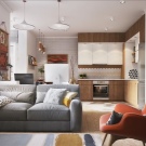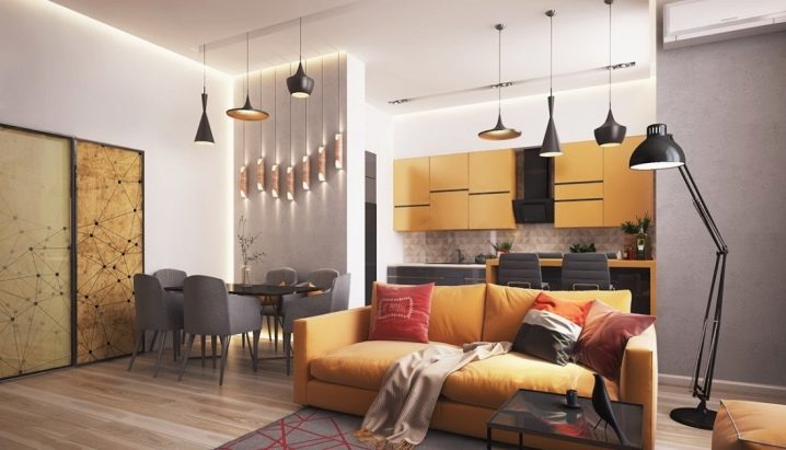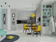 - مساحة مطبخ صغيرة تتناسب مع ثلثي الجدار. يتم توفير كل شيء في مجموعة صغيرة: مغسلة وموقد مع فرن وحتى غطاء ضيق. الغرفة بها منطقة لتناول الطعام للضيوف (طاولة وكراسي في الزاوية) ومنطقة إفطار خلف البار بالقرب من مجموعة المطبخ. منطقة المعيشة مفصولة بأريكة تواجه المطبخ. تم تطوير تصميم الغرفة بلونين رئيسيين – أصفر داكن ورمادي – أسود. يتكرر هذان الظلالان في تفاصيل داخلية مختلفة ، ويربطان كل شيء في مجموعة واحدة..