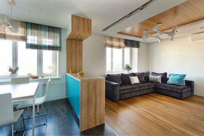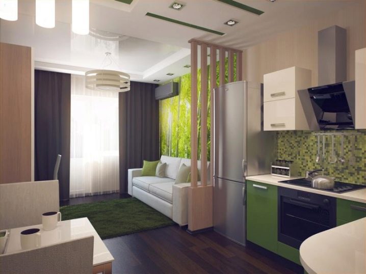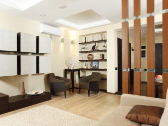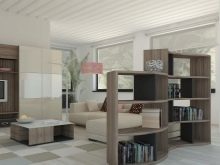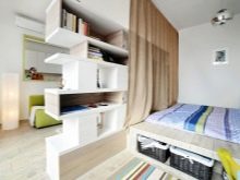 مثال على قسم وظيفي هو رف الشرائح, حيث يمكنك وضع الكتب والمزهريات والأشياء الصغيرة عليها. في هذه الحالة ، سينقل الهيكل الضوء ولن يفسد الغرفة. غالبًا ما يتم فصل منطقة المطبخ عن غرفة المعيشة بواسطة طاولة بار – فهي بمثابة طاولة طعام وهي الحد الأفقي المادي لجزئي الغرفة. يحظى الأثاث متعدد الوظائف بشعبية كبيرة في شقق الاستوديو. على سبيل المثال ، سرير بطابقين أو سرير مرتفع ، عندما يكون مكان النوم في الأعلى ، ومنطقة العمل (مكتب الكمبيوتر) في الأسفل ، أو أريكة.