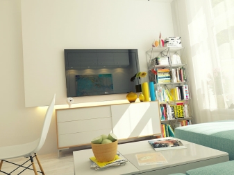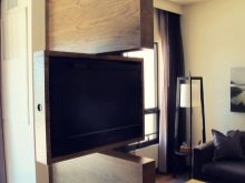 يجب وضع التلفزيون على الحائط على حامل خاص. خزانات الإلكترونيات سوف تشوش الغرفة.