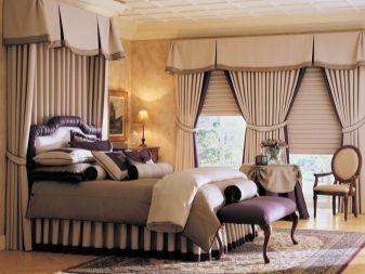 بعد الإشارة إلى الجانب العملي ، يجدر الانتباه إلى القضايا الجمالية. تعد منسوجات النوافذ جزءًا من التصميم الذي يمكن أن يحسن بشكل كبير المظهر العام للغرفة ، ولكنه أيضًا يبسطها بشكل كبير. من المهم أن يبدو كل شيء متناغمًا. في غرف النوم المخططة بشكل مثالي ، يتم التفكير في جميع المنسوجات ككل: يتم اختيار أقمشة الستائر والمفارش والوسائد الزخرفية وأغطية الكراسي وغيرها على أنها متشابهة أو متطابقة. في هذه الحالة ، يمكن أن تتناقض المنسوجات مع مخطط الألوان العام للغرفة أو تكملها ، وتثريها بظلال جديدة.