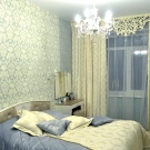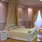يبدو أن تصميم غرفة النوم هذه قد نزل من صفحات القصة الخيالية حول ملكة الثلج. مزيج من الظلال الزرقاء الباردة مع الأصفر الناعم يخلق شعورًا ببرودة الشتاء. في الوقت نفسه ، يضفي التول الخفيف متجدد الهواء ، والمزين بتطريز ذهبي ، لمسة من الأناقة الرشيقة. تبدو المظلة أصلية بشكل لا يصدق ، ويمكننا القول بأمان أنها أهم ما يميز هذه الغرفة. من المدهش أن يتم التفكير بعناية في مزيج المنسوجات: يبدو أن النافذة المغطاة بلمبريكين تتدفق إلى المظلة وإلى غطاء السرير. تكمل الموجات الناعمة على جميع عناصر النسيج الصورة العامة ، مما يجعلها أكثر تفكيرًا.