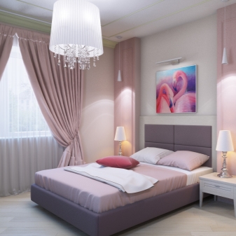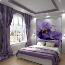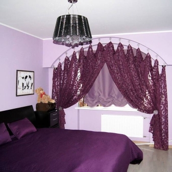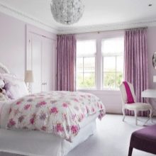 ما عدا الستائر أو الستائر, خلفية أرجواني مناسبة لغرفة نوم مدمجة. إذا كنت بحاجة إلى تزيين غرفة لفتاة رومانسية وحسية ، فمن المستحسن أن تختار ستائر بنفسجية. لا يمكن أن تكون مواد النسيج المستخدمة للستائر أحادية اللون فقط. ستائر الليلك ذات الخطوط أو الأنماط الأرجواني والأرجواني والأزرق والوردي ستكون زخرفة ملونة.