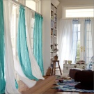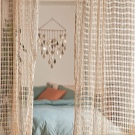 - ستبدو شبكة كبيرة أو صغيرة من الخيوط الدقيقة جميلة في غرفة المعيشة. يمكن استخدامه لتزيين نافذة تفتح في الموسم الدافئ. وإذا لم يكن لدى المستأجرين ما يكفي من الأصالة والألوان ، فيمكنك استخدام عدة طبقات من الستائر بألوان مختلفة..