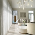 - بالنسبة للقاعة ، من الأفضل اختيار الخيار بحلقات كبيرة. من الأفضل تعليق الستارة على كورنيش حديدي به ثقوب كبيرة.