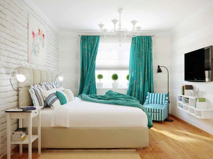 إذا كانت غرفة النوم مزينة بألوان الباستيل الهادئة ، فيجب الانتباه إلى مجموعات أكثر إشراقًا. على سبيل المثال ، يمكن استكمال مكان التشطيب والنوم الفيروز أو الأخضر. يتم دمجها بشكل إيجابي مع ظلال الضوء ولا تفرط في سطوع الغلاف الجوي. من الجيد استخدام لون الفستق..