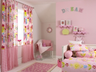 في الحالات التي تكون فيها الجدران مزينة بألوان زهرية ، فمن الأفضل اختيار ستائر ممتازة بنصف نغمة أو نغمة.. ثم لن يتم تحميل التصميم بشكل زائد. على سبيل المثال ، إذا تم استخدام ورق حائط وردي شاحب في غرفة الأطفال ، فمن الأفضل اختيار الستائر بلون أغمق..