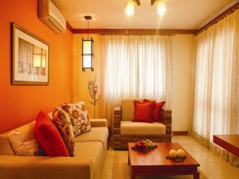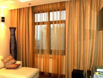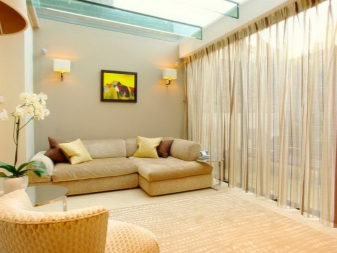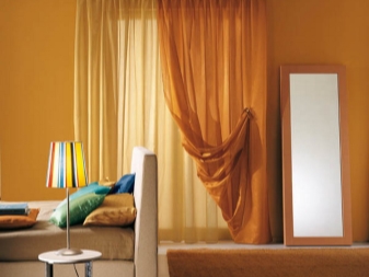 الدهانات العارية توسع المساحة بشكل كبير. تضفي الظلال الصفراء والبرتقالية والخوخية مزيدًا من الإشراق على الغرفة وإشراقها. من الأفضل اختيارهم للغرف المظلمة. يمكن أن يبدو التول الأبيض الشفاف متناثرًا ورخيصًا جدًا. لذلك ، للحصول على مظهر أفضل ، يجدر شراء قماش أطول بمرتين إلى ثلاث مرات من الستارة..