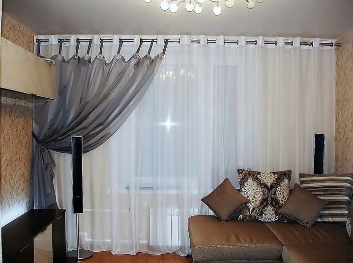 سيكون التول المزدوج على الثقوب مفيدًا في غرفة بها باب شرفة. نظرًا لحقيقة أنه غالبًا ما يكون مفتوحًا في الصيف ، يدخل الكثير من ضوء الشمس إلى الغرفة. لذلك ، ستحمي مجموعة من نسيجين التول من التلاشي والغرفة من الإضاءة المفرطة.. وستسمح لك الحلقات بالوصول بحرية إلى الشرفة. بالإضافة إلى ذلك ، فإن هذا الإصدار من الستائر يخلق نوعًا من التأثير ثلاثي الأبعاد في غرفة صغيرة. يتم دمج الستائر الخاصة بنوافذ أو ثلاث نوافذ بشكل مثالي مع المشابك والشرائط ، والتي يجب أن تتناسب بالضرورة مع النمط العام لغرفة المعيشة. نموذج جميل جدًا لغرف المعيشة الكبيرة – تول من الألوان المدمجة. الأعلى – مادة الأورجانزا الشفافة. القاع – مزيج من العناصر الزخرفية. يتم دمج الخيار تمامًا مع الثقوب المصنوعة من التركيبات المعدنية أو البلاستيكية.