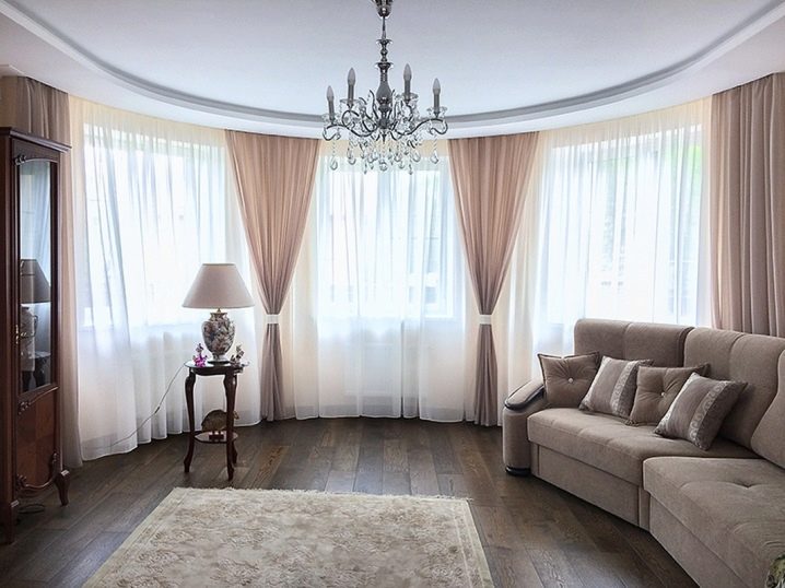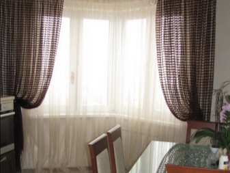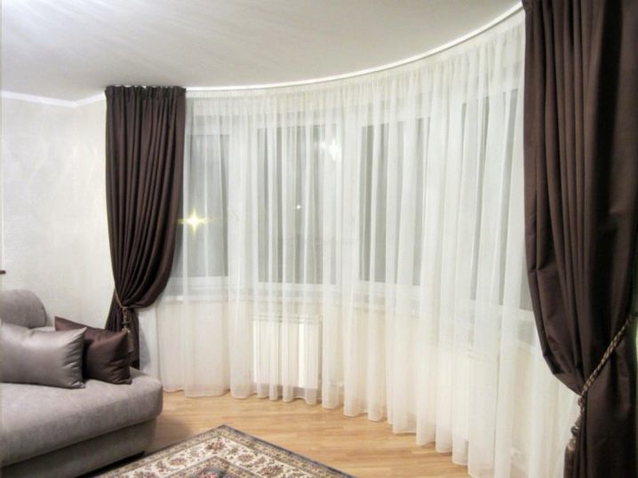 يتم تعليق التول على مشابك مختلفة: شريط ، خطافات بلاستيكية ، ثقوب ، حلقات منسوجة. لكن اختيار أداة التثبيت مرة أخرى يعتمد على مجموعة ألواح النوافذ. سيبدو التول الفردي الموجود على الثقوب مرهقًا للغاية ومدهشًا ، ولكن إذا أضفت ستائر قاتمة فوق الستائر ، فإن الحلقات المعدنية ستأخذ صورة أنيقة ومعبرة. تم اختراع أصعب الستائر للنوافذ ذات الشكل غير العادي. الأفاريز المقوسة مصنوعة من الألومنيوم ، لذا فهي تتكيف تمامًا مع انحناء مساحة النافذة. يتطلب القوس طبقتين من القماش على الأقل. لذلك ، أولاً وقبل كل شيء ، يتم إرفاق تول نصف شفاف بكورنيش من صفين ، ثم ستائر في الأعلى.