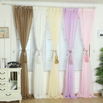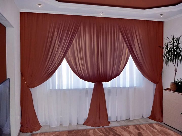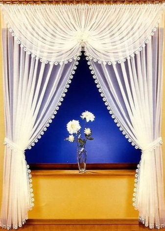 في الأساس ، يفضل الكثير من الناس التول الطويل البسيط المصنوع من الأورجانزا أو الشيفون أو الحجاب. يمكنك استخدامها في تصميمات داخلية مختلفة وإضافة الملحقات بنفسك. يكفي شراء أحد هذه الأقمشة ، وخياطته على طول الجزء السفلي ، وإدخال الجديل – وستارة تقليدية جاهزة. من أجل الأصالة ، يمكنك عمل ثنيات القوس أو إضافة حلقات من الحرير وحبل ذهبي للربط