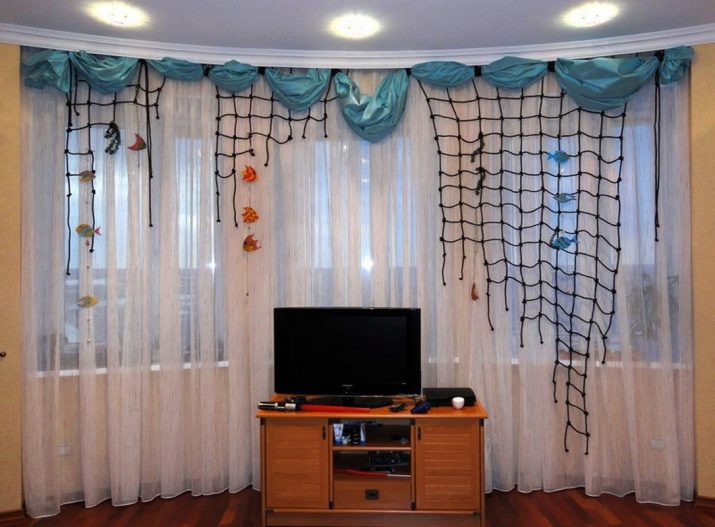 التول البحري هو اكتشاف تصميم جديد. هذه ستارة مورقة مصنوعة بظلال زرقاء باردة. الأقمشة تضفي على الأسلوب مزيدًا من الخفة والنضارة. و lambrequins تجعلها أكثر صرامة وتنوعًا. العيب الوحيد لهذا النمط هو تغيير الفصول خارج النافذة. على سبيل المثال ، في فصل الشتاء ، لن يبدو تساقط الثلوج والأقمشة الزرقاء في مظهر بحري متناغم للغاية..