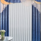 التول الداكن يقلل من القدم المربع. تضفي الألوان الأزرق والأرجواني والبنفسجي البرودة على الغرفة. تخلق الخيوط الفضية المنسوجة في القماش أجواء احتفالية ، بينما تعزز النغمات اللامعة الإضاءة.