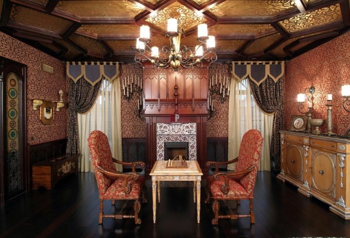 أعطى أسلوب الشرق التصميم اتجاهًا عصريًا ، والذي أصبح شائعًا اليوم ليس فقط في بلدان الجنوب الشرقي ، ولكن أيضًا في الغرب. لا يمكن الخلط بينه وبين أي نمط آخر. يتم الجمع بين الألوان الداكنة الفاخرة بظلال عنابي مع الدانتيل الذهبي المصنوع من مواد ثمينة. سوف يروق هذا التول لأولئك الذين يقدرون ثراء الديكور الداخلي في غرفة المعيشة. التفاصيل الرئيسية هنا هي عدد كبير من الستائر والأنماط والألوان الغنية..