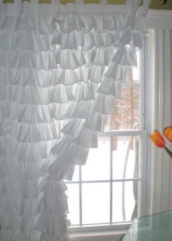 إذا كانت النافذة أفقية أو كانت في مكان مناسب ، فيمكنك اختيار التول بأمان حتى حافة النافذة. تبدو جيدة في الغرف الصغيرة. هذا الخيار لا يفسد المساحة ويخلق الراحة. في أنماط بروفنسال والريف ، تحظى الستائر القصيرة بشعبية كبيرة. لكنها ستبدو رائعة فقط إذا لم يكن هناك مبرد تحت النافذة..