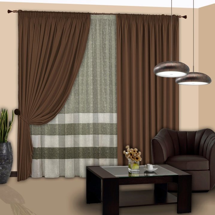 إذا كانت غرفة المعيشة بأكملها مصنوعة من ظلال بنية اللون ، فستكون عناصر اللؤلؤ والفضة والوردي الباهت إضافة جيدة للستائر من هذا اللون. مثل هذه الحلول تضيف التوابل والسطوع إلى الجو الكئيب..