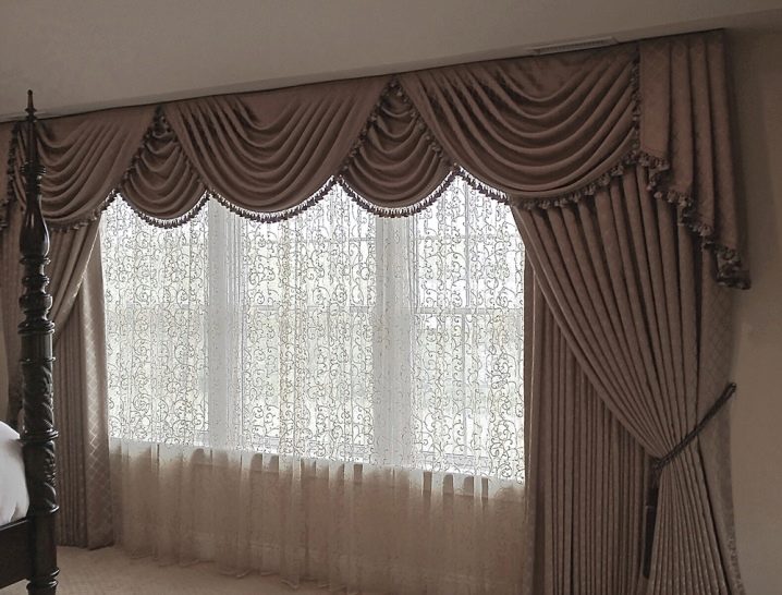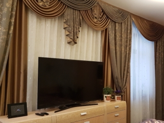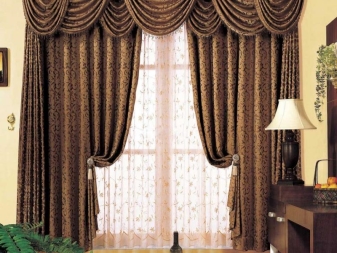 - lambrequins – زخرفة نافذة مزخرفة ، تقع أفقيًا بالنسبة إلى الجزء العلوي من الستائر. إلى جانب النوع الأول من الستائر ، يتم استخدامها في القاعات وغرف المعيشة والمطابخ ؛