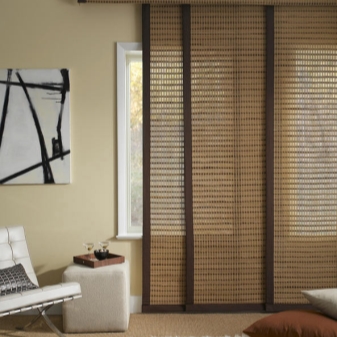 إذا كانت نوافذ غرفة المعيشة تواجه الجانب المشمس ، فإن الستائر المصنوعة من الخيزران تعد خيارًا جيدًا. من ناحية ، فهي تحمي من الضوء ، ومن ناحية أخرى ، لا تجعل الغرفة تبدو وكأنها حمام..