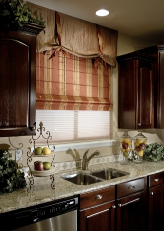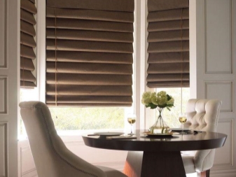 ستائر بنية ذات خطوط تمثل نسيجًا يتجمع في طيات. يتم تجميع النوع النمساوي من المنتجات ، على عكس الأنواع الأخرى ، من الأسفل فقط. هذه الستائر ، على الرغم من لونها الداكن ، تضيف عناصر الإضاءة إلى الداخل..