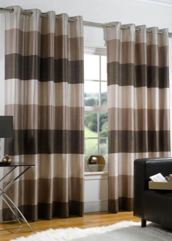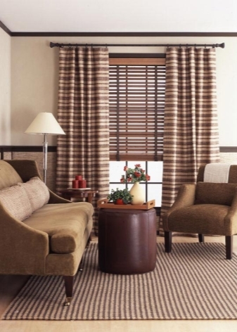 تتماشى الستائر المخططة ذات اللون البني بشكل جيد مع الأثاث الداكن والأرضيات الخشبية. يربطون كل ألوان الغرفة بتكوين واحد. هذا الخيار هو الأفضل لتأطير نافذة كبيرة..