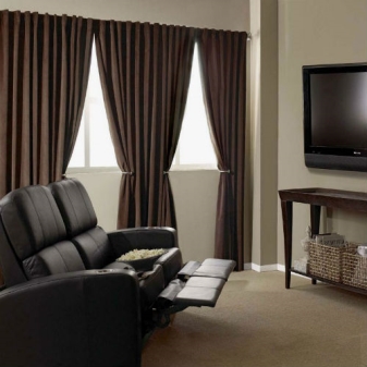 مزيج الألوان في الداخل لا يقل أهمية عن اختيار الستائر نفسها. تتماشى الستائر البنية بشكل جيد مع الألوان البيضاء والأزرق والأخضر الفاتح لغرفة المعيشة. ومع ذلك ، بالنسبة لبعض ظلال اللون الأخضر ، من الأفضل عدم اختيار الستائر المظلمة ، ولكن الستائر الخفيفة ذات السطح غير اللامع: