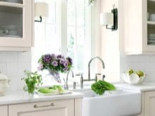 المطبخ الأبيض الأنيق نظيف ومتطور. هنا ، لا تصل الستائر الفرنسية الشفافة مع الأقمشة إلى عتبة النافذة ، حيث توجد منطقة عمل بها مغسلة. تكتمل الستارة بستارة غير متناظرة مزينة بمشبك حائط. كل شيء مريح جدا وجميل. يتم التأكيد على خفة المقصورة من خلال اللون الأبيض الذي لا يبدو أنه متسخ.