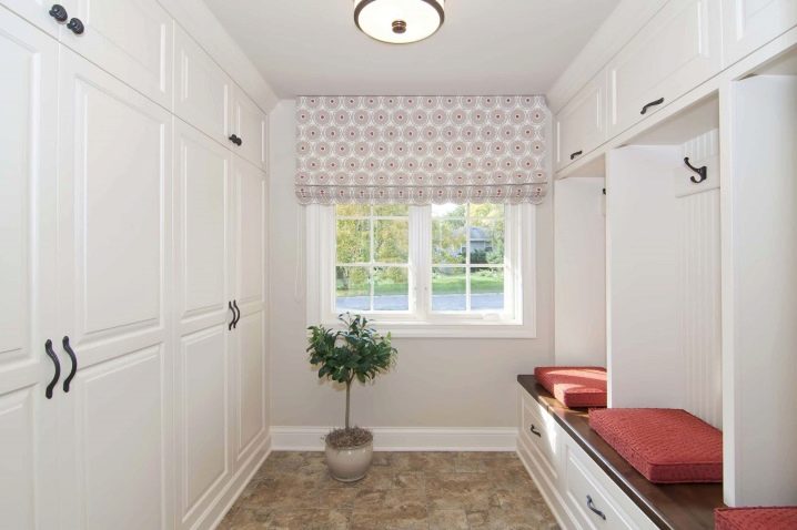 قاعة مدخل مثالية في منزل خاص مع نافذة مزينة بستارة رومانية بطباعة أصلية ومريحة للغاية وعملية. مساحات التخزين مليئة بالأدراج والشماعات ، كما أن وجود نافذة بألوان فاتحة يضيف سحرًا ووحدة في الأناقة..