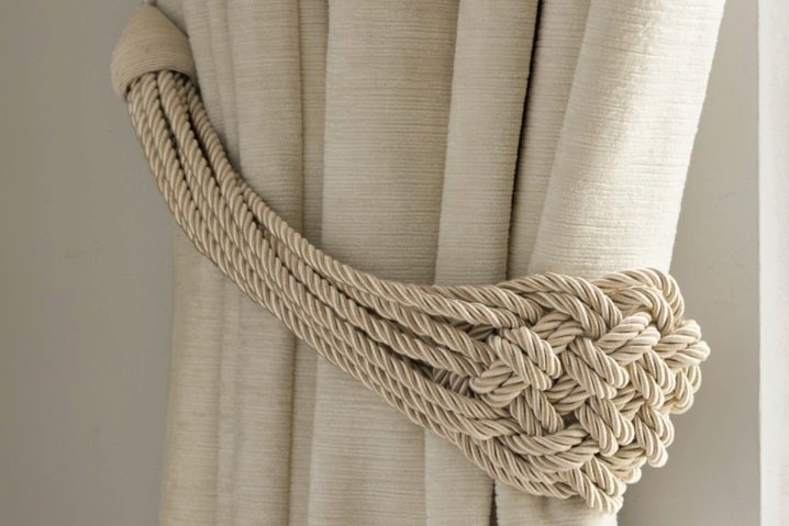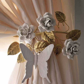- تبدو الحوامل جذابة للغاية من القماش. تبدو هذه العناصر الزخرفية جميلة جدًا ومتنوعة ، فهي أزهار وشرابات وأقواس وشرائط. يتم استخدامها للستائر الدوارة وكذلك الموديلات الكلاسيكية. تبدو تركيبة الزهور مشرقة جدًا ، وهو ما يتناقض مع قماش الستارة..